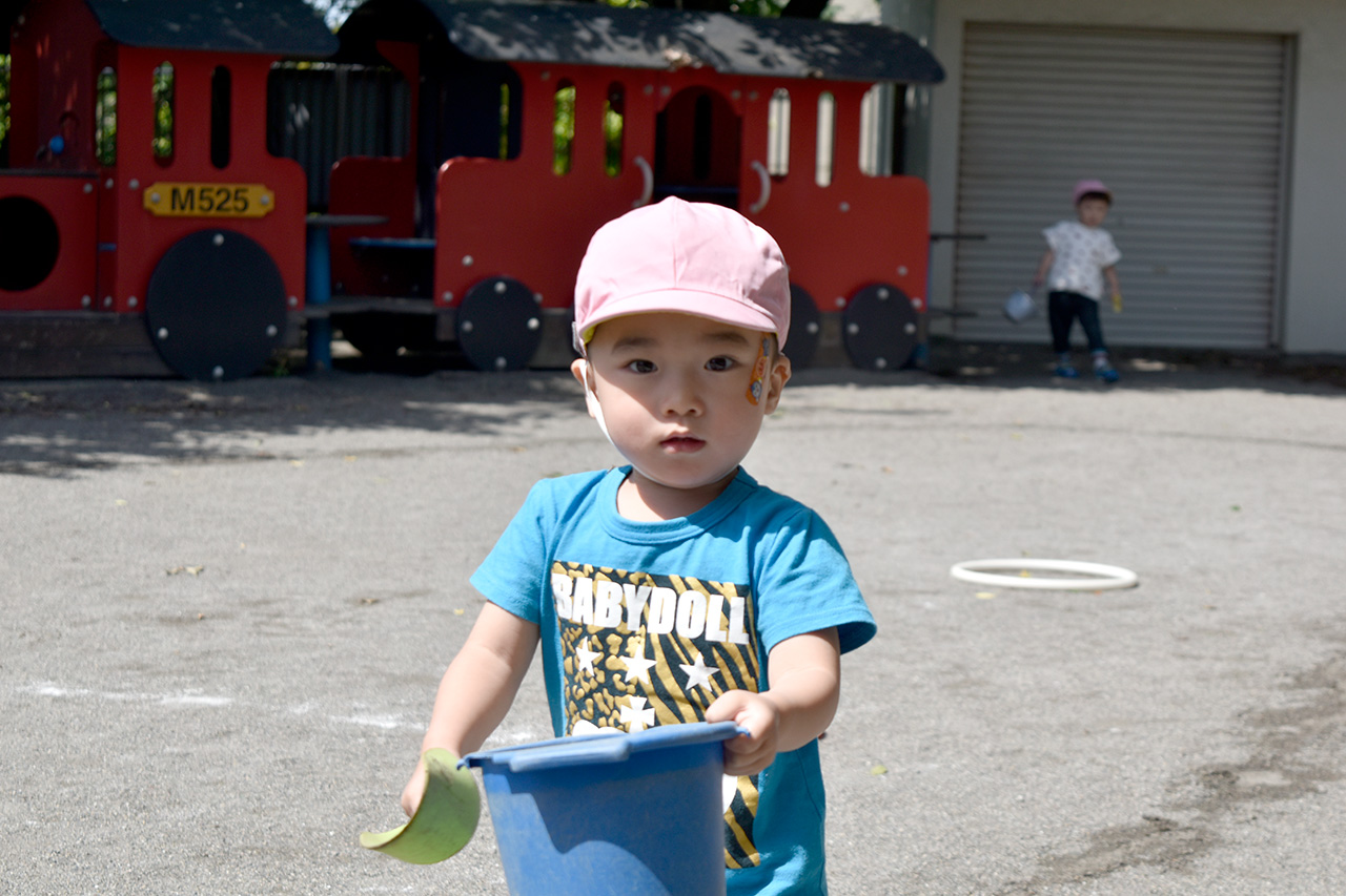 広々とした園庭では沢山体を動かして遊びます。夏には桜の木を見上げながら夢中になってセミを探したり、秋には色づいた落ち葉を砂のケーキに飾ったりと、自然を感じながら遊びを広げています。
